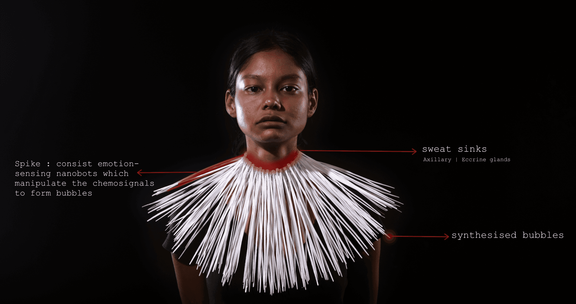 At the core of the project is a wearable bio-translator that renders the wearer’s subconscious emotional state into tangible outputs; color-coded bubbles and synthesised scent, forming a sensory portrait of affective data.